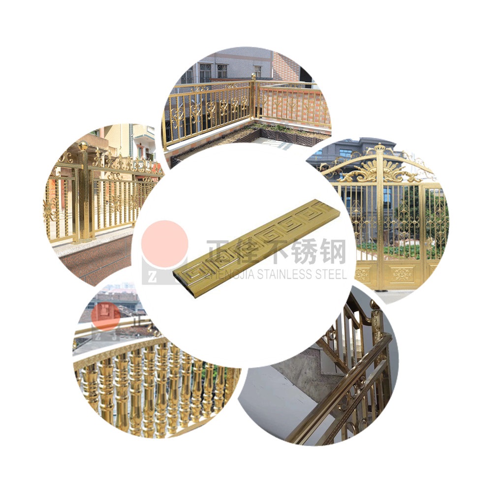 采用优质304不锈钢矩形管表面镀金,耐腐蚀性能显著,表面美观耐看,广泛应用于制作各种不锈钢制品:楼梯栏杆扶手、屏风、大门、防盗网等。