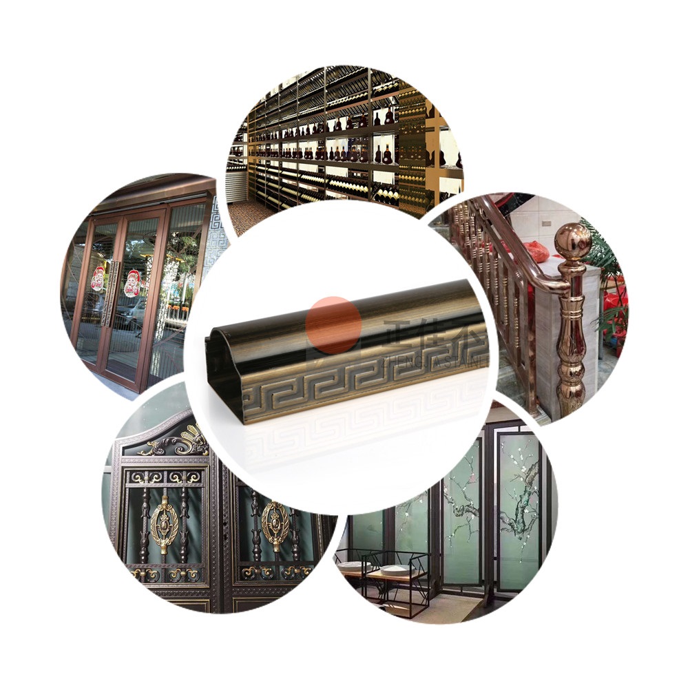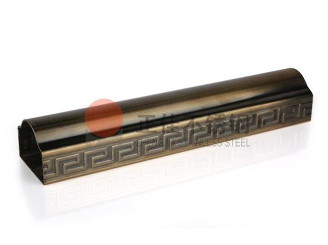 本款产品是新型的艺术不锈钢装饰管,在不锈钢装饰管的表面压出回形花纹再镀铜使不锈钢管表面呈现古铜色,可以定制各种个性化花纹。